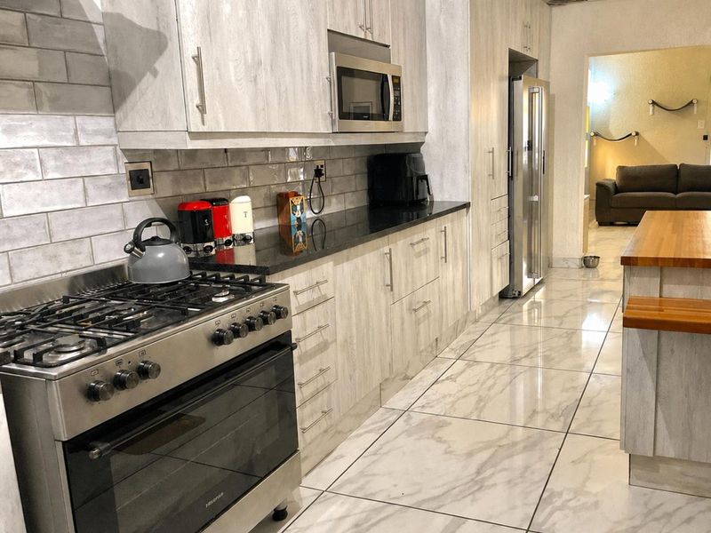 Entertainer's dream near Hoerskool Dr EG Jansen and Laerskool Concordia, with expansive entertainment area featuring bar, Jacuzzi and pool lapa. Three bedrooms, two baths, multiple garages.