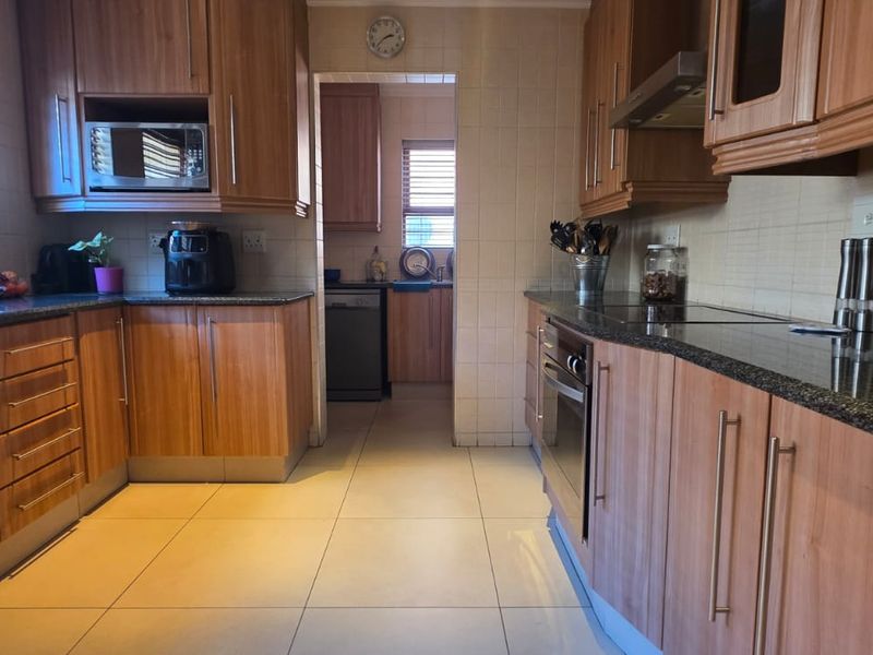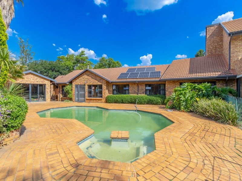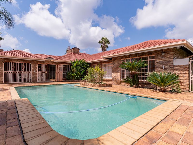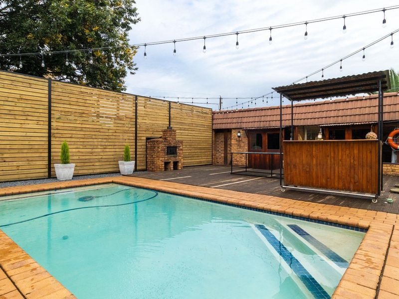 Entertainer's paradise in Bartlett, Boksburg, walking distance to Woodlands International College and shopping, featuring a heated swimming pool, manicured garden and three bedrooms, 2.5 baths, plus four car garage.