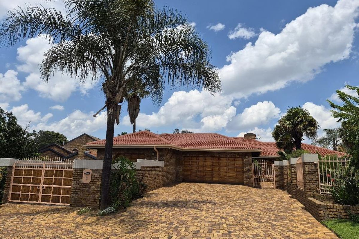Outside, the property showcases a beautiful blue pool and meticulously manicured garden. Additional amenities include a solar geyser, helpers' accommodation, and three motorized garages. The home is equipped with a robust security system featuring eight cameras and beams around the property.