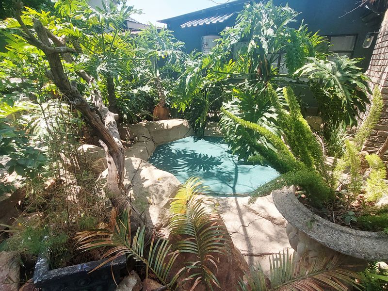 Entertainer’s tropical oasis in Boksburg near St Dominic’s and CBC, with open-plan kitchen flowing to jacuzzi entertainment area and separate 1-bed garden cottage — 3-bed, 2-bath, ample covered parking.