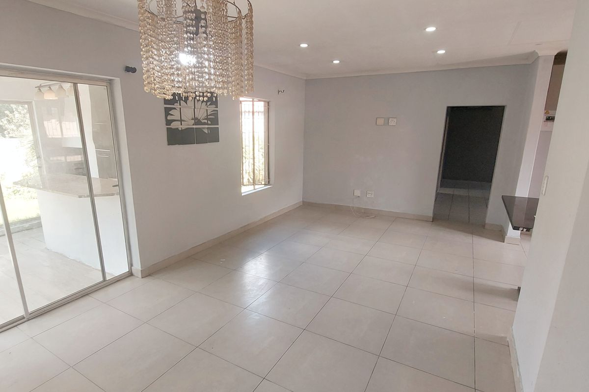 The lounge extends into an enclosed entertainment area, complete with a built-in braai and bar—perfect for hosting family and friends all year round. Outside, the garden offers ample space for relaxation and is ideal for pet lovers, providing a secure environment for your furry companions to roam freely.