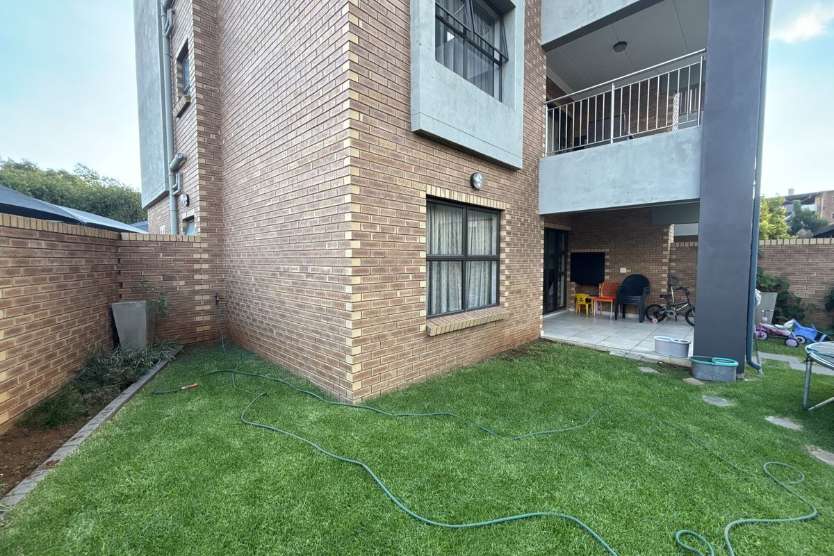 Effortless indoor-outdoor living in the sought-after Views complex, Boksburg — private garden and patio with built-in braai, clubhouse, pool, gym; two beds, two baths, two parking.