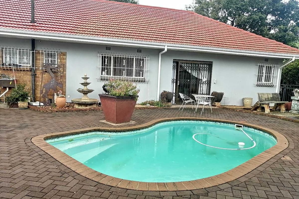 Relax in a private family haven on a peaceful tree-lined street, with tiled patio, pool access and separate bachelor flat — four bedrooms, two bathrooms, three garages.