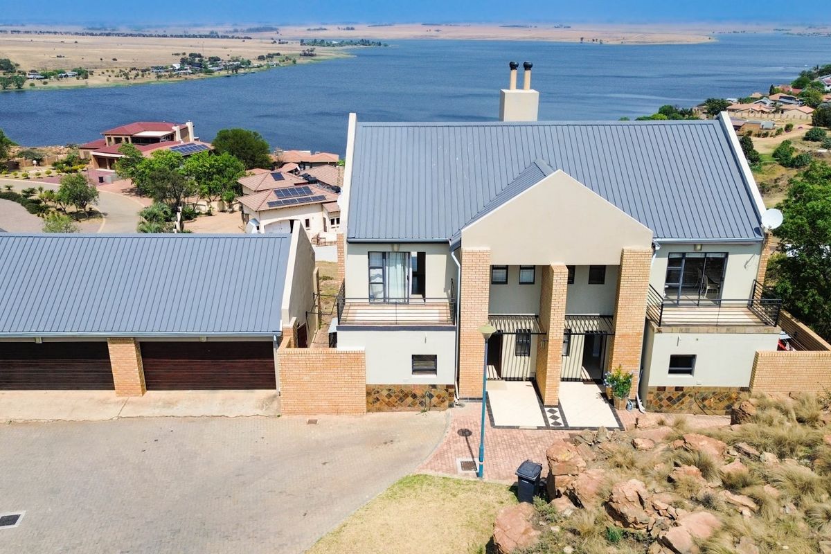 Escape to secure Aqua Vista Mountain Estate on Bronkhorstspruit Dam, enjoying panoramic 180° water and mountain views, open-plan kitchen and decks with built-in braai. Three bedrooms, three baths.