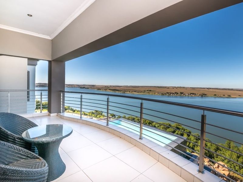 Elevated lakeside living above Bronkhorstspruit Dam in exclusive Kungwini Ranch — designed for entertaining with a glass-framed pool deck. Five en-suite bedrooms, boat garage.