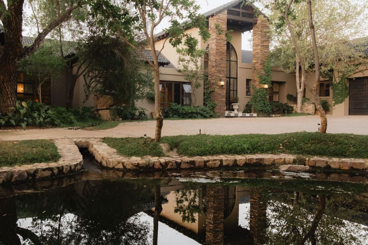 Entertainer's paradise in Blair Atholl Golf and Equestrian Estate, front-row dam views and tranquil water-feature gardens, indoor/outdoor braai, five bedrooms, four baths and four garages.