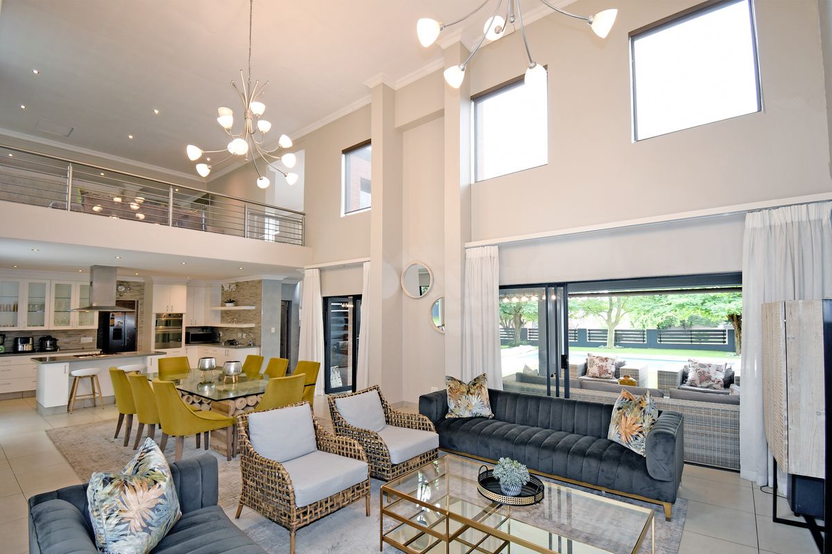Designed with generous proportions and seamless connectivity, this home features three expansive living areas, each effortlessly blending into the large open-plan kitchen with a spacious pantry and scullery. Double-volume ceilings and immaculate tiled flooring enhance the open, airy feel, creating an environment of elegance and comfort.