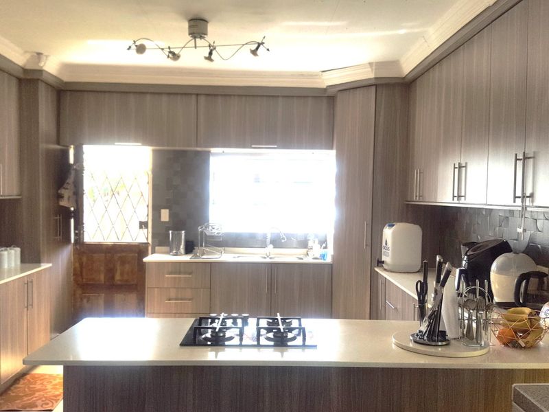 Secure retreat in a quiet, family-friendly suburb with entertainer's lapa overlooking a lush garden, chef's kitchen and scullery, plus domestic quarters; five bedrooms, three baths, four garages.