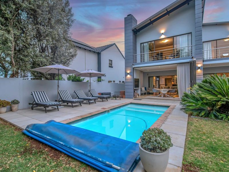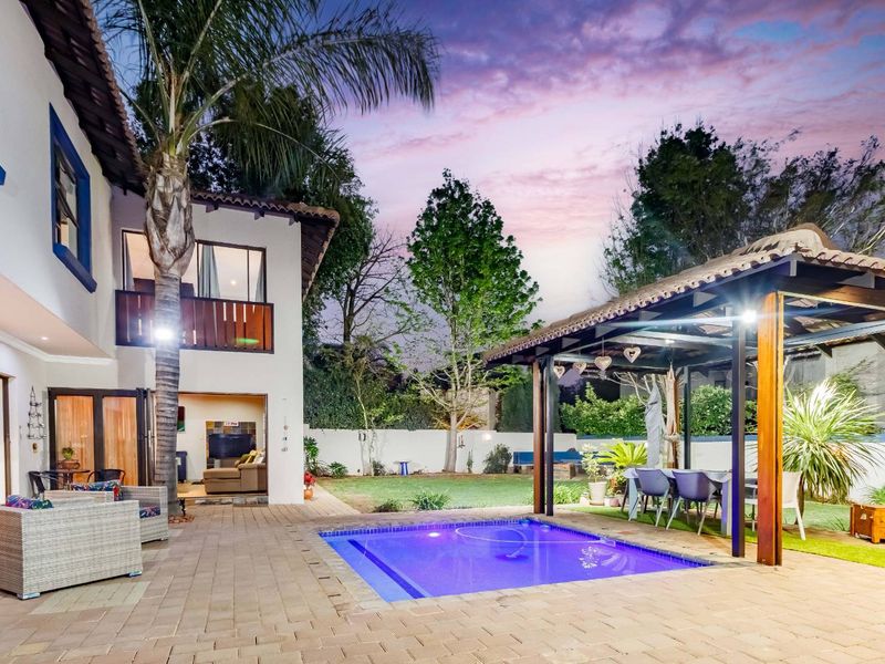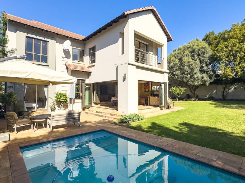 Effortless entertaining with indoor-outdoor flow in a leafy family neighbourhood, featuring a built-in braai, pizza oven, pool and fire boma. Four beds, four baths, double garage.