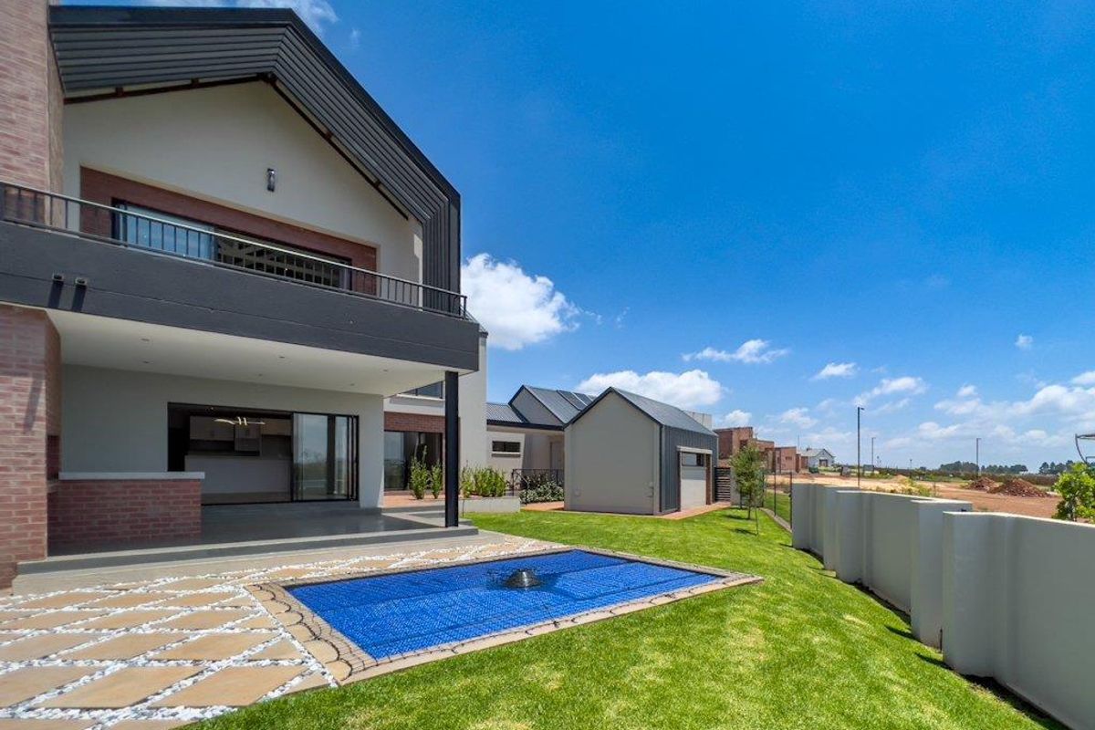 Park-side Midstream Estate family home ideal for entertaining with covered patio, pool and built-in braai; solar-backed energy, private balconies and three garages, four bedrooms, three bathrooms.