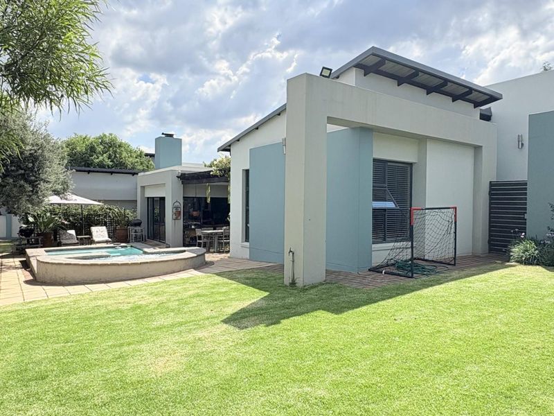 Entertainer's sanctuary in Midstream village: double-volume entrance, north-facing open-plan living, gourmet gas kitchen with serving hatch, poolside patio and garden. Four bedrooms, three baths, three garages.