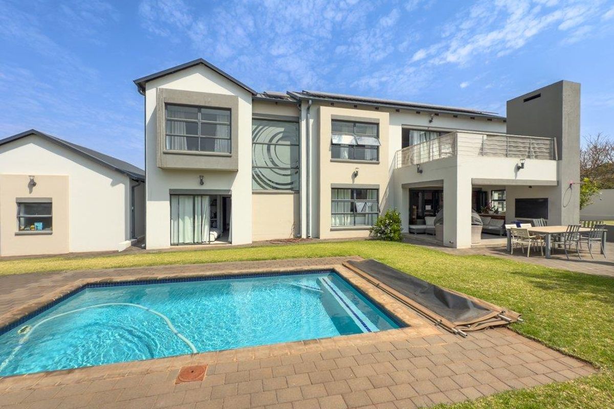 Entertainer's sanctuary in Midstream village: double-volume entrance, north-facing open-plan living, gourmet gas kitchen with serving hatch, poolside patio and garden. Four bedrooms, three baths, three garages.
