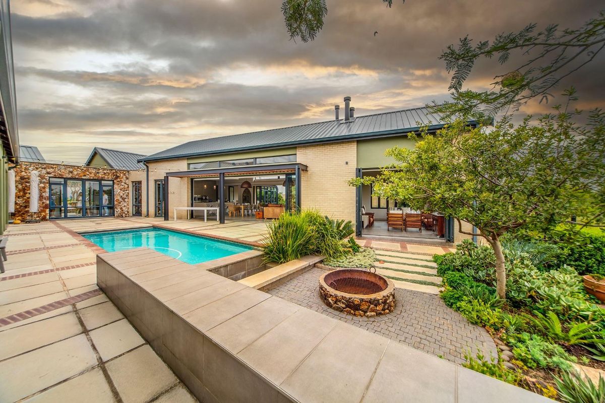 The heart of the home boasts open-plan living areas, including a bespoke kitchen fitted with integrated appliances, flowing seamlessly into a generous dining area and a TV lounge with a feature fireplace. Just off the living areas is an enclosed entertainment room with a built-in braai, overlooking the pool, landscaped garden, and greenbelt — perfect for year-round entertaining.