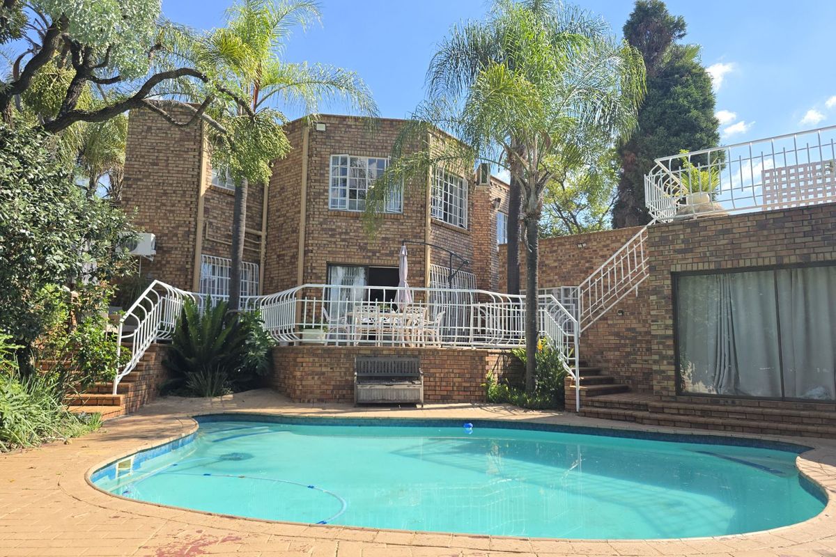 Entertainer's multilevel home in Zwartkop with panoramic city views and easy Gautrain access, featuring pool with tiled entertainment area and kitchenette — ideal for guesthouse living; 8 beds, 6 baths.
