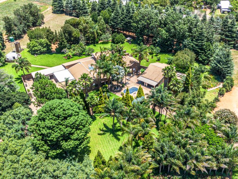 Entertainer's dream retreat 20 km from Pretoria East, near popular wedding venues — thatched lapa with outdoor kitchen and pool, palm-lined grounds, five beds, five baths, double garage.