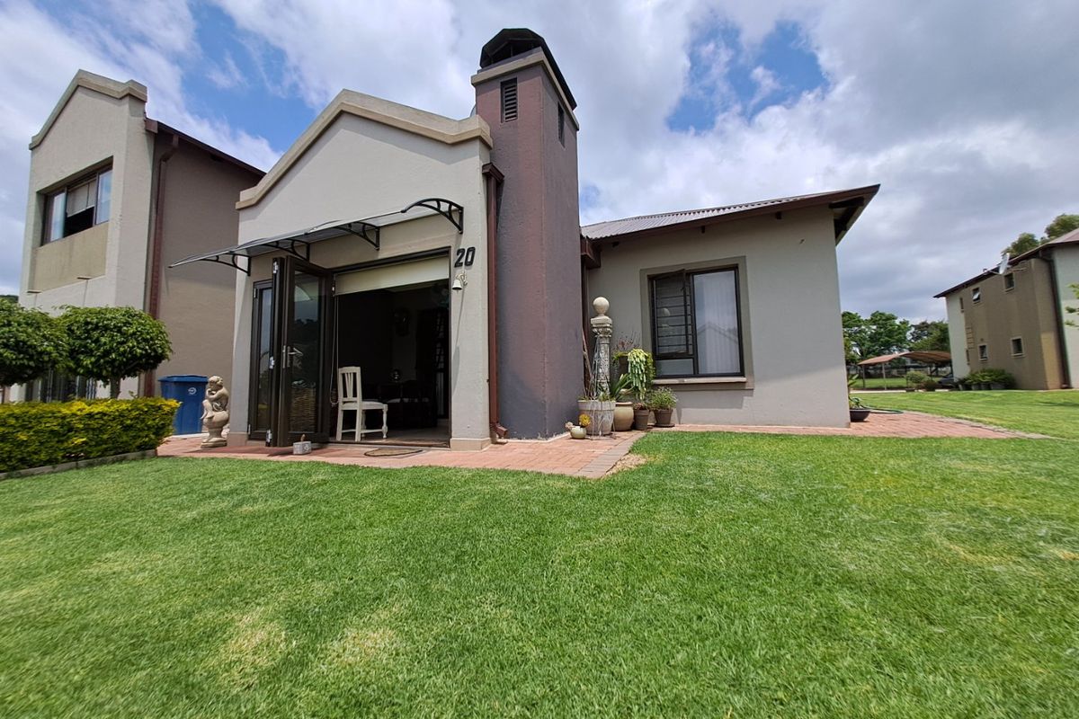Golf-course living in Cullinan Golf and Lifestyle Estate, with secure, lock-up-and-go convenience and a private covered patio with built-in braai — two bedrooms, two bathrooms, two covered bays.