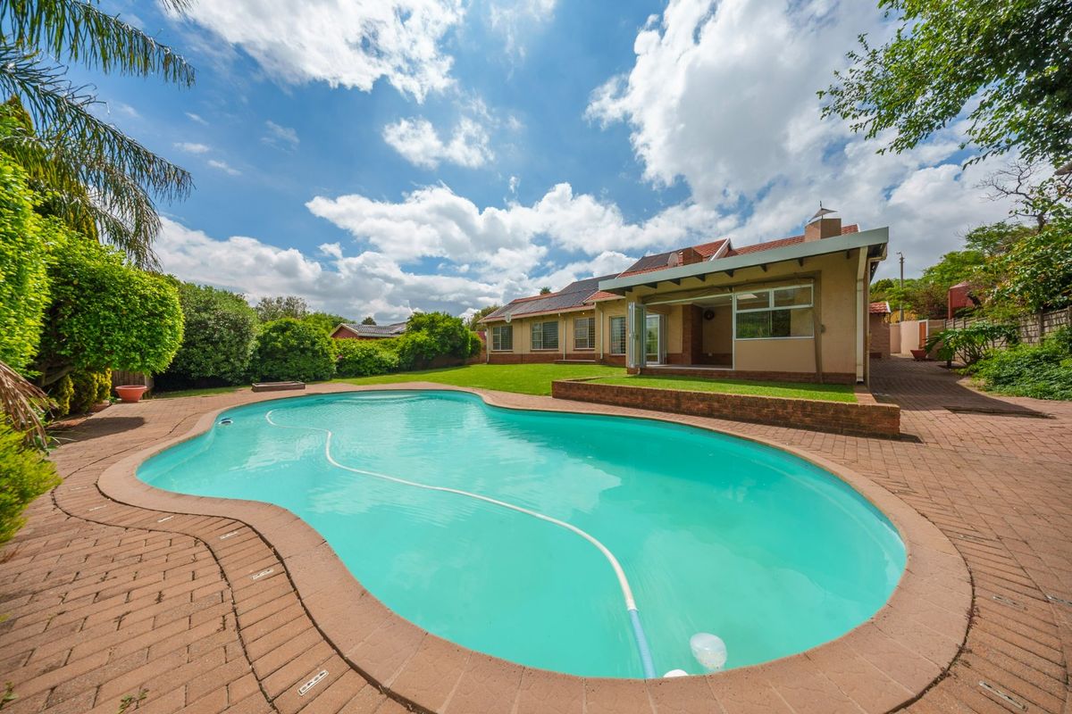 The dining room area leads onto yet another spacious family room (with guest loo) and boasts a further feature with an enclosed braai patio area with stack doors opening up onto the lovely garden and solar heated pool. An absolute entertainers delight!