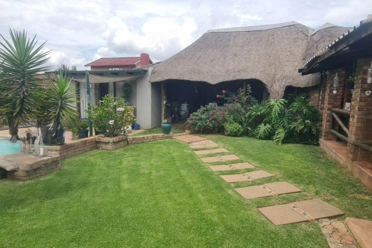 Relaxed family living in a quiet neighborhood with poolside entertaining and a manicured garden, thatched braai pavilion, plus a flatlet — three bedrooms and two bathrooms.