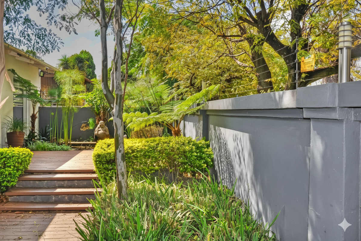 Ideal for entertaining with effortless indoor-outdoor flow in a quiet neighbourhood — garden entrance leads to open-plan living with built-in braai and pool. Four beds, four baths, double garage.