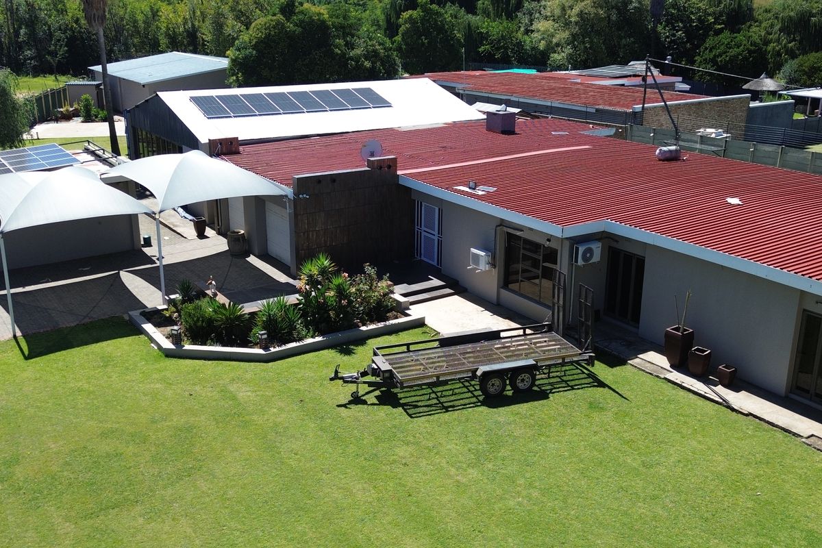Off-grid entertainment retreat in a secluded upmarket setting, perfect for family gatherings — sleek pool with built-in braai and entertainment area, four bedrooms, two bathrooms, 12-car garage.
