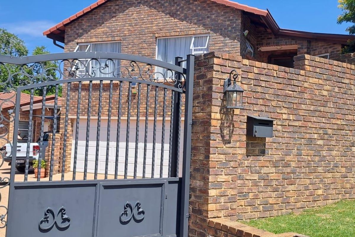 Upon arrival, the home presents an impressive appeal with its robust, secure entrance featuring an ornate gate, electric fencing, and a paved driveway, all complemented by a well-maintained front lawn. The exterior is a testament to enduring brick construction and a tiled roof, with Fox Security monitoring and 24-hour security ensuring peace of mind within this vibrant South African community.