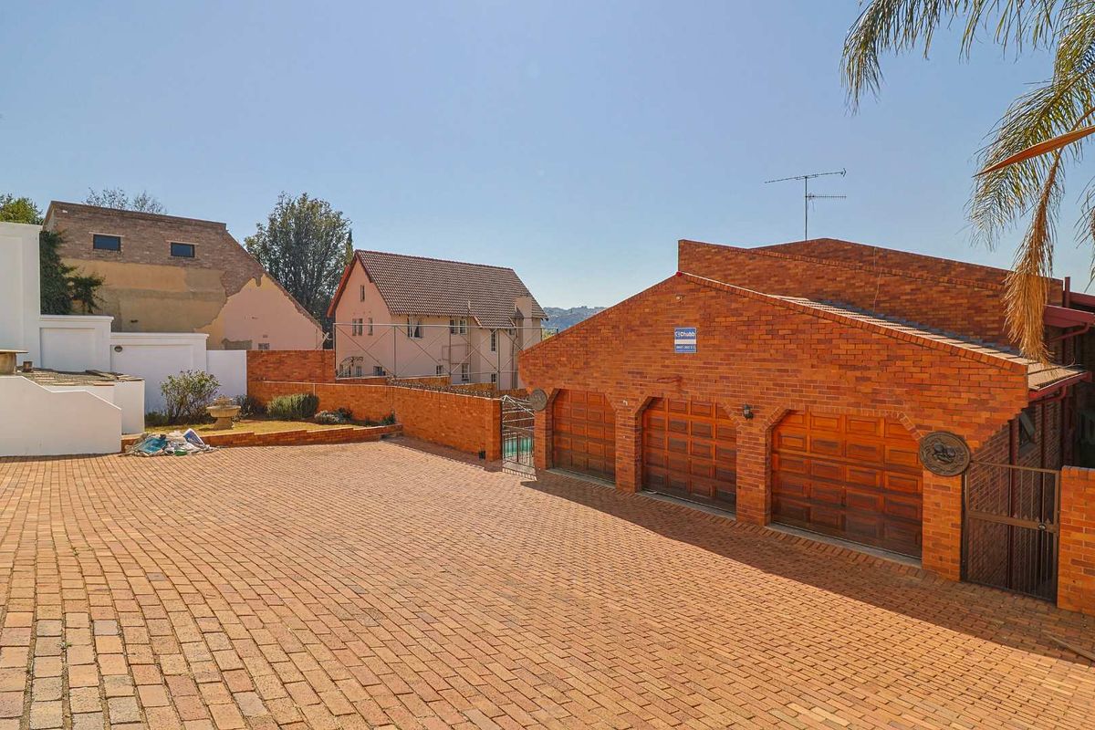 Additional features include three garages for ample parking, Trelli door security bars for peace of mind, and staff accommodation. The home is adorned with elegant porcelain tiles and solid wood balustrading, adding a touch of sophistication throughout.