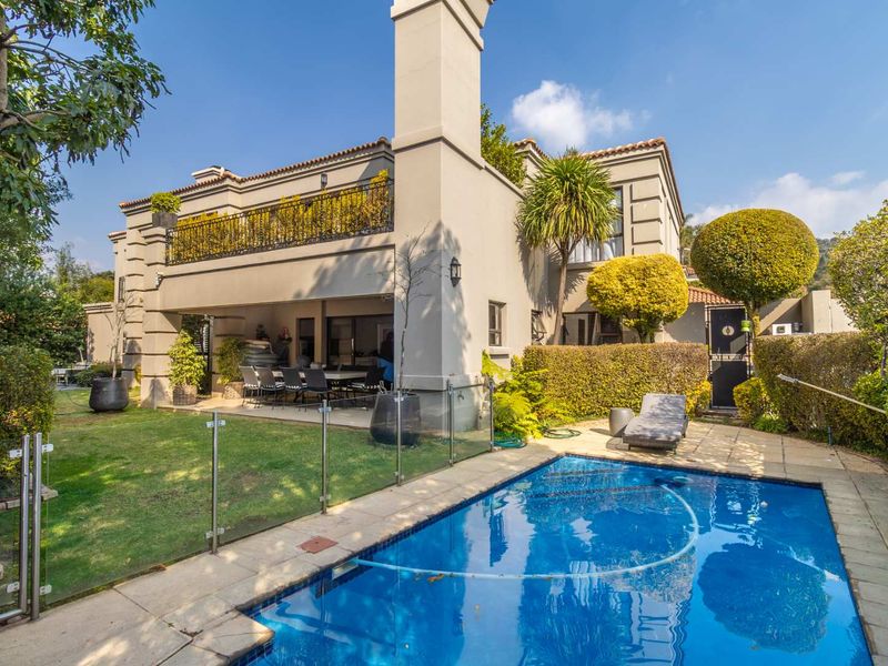 Resort-style family living with poolside terrace and braai in prestigious Linksfield Ridge, Gauteng — private balcony views, solar panels, cottage and staff quarters; four bedrooms, four bathrooms, three-car garage.