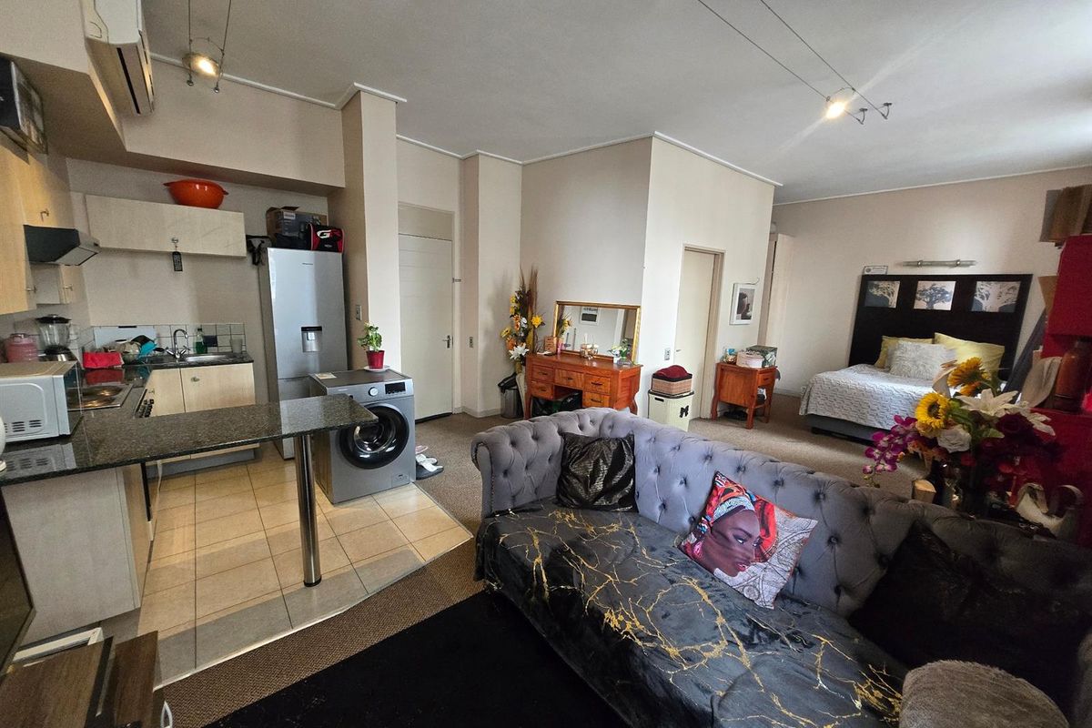 Urban bachelor pad in Marshalltown for convenient city living and easy access to Johannesburg; bright lounge, functional kitchen, one bathroom, plus secure parking bay with 24-hour security.