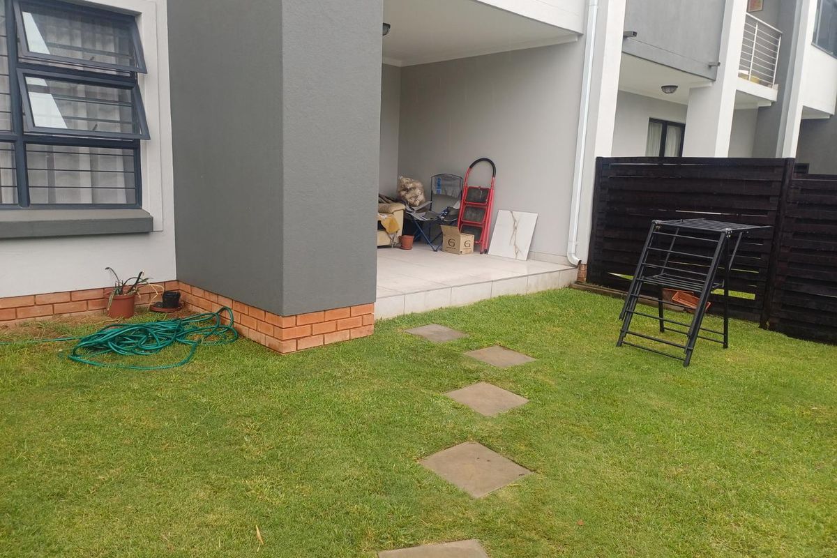 Family-friendly ground-floor townhouse in secure complex near Gautrain bus stop and Woodmead Square, with granite kitchen, patio with built-in braai and private garden. Three beds, two baths.