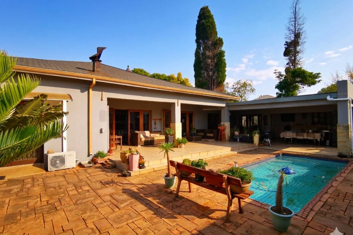 Entertainer's sanctuary in tree-lined Sydenham, minutes from Sandton and Norwood, with an enclosed entertainment wing and built-in braai overlooking pool; three bedrooms, 3.5 baths.