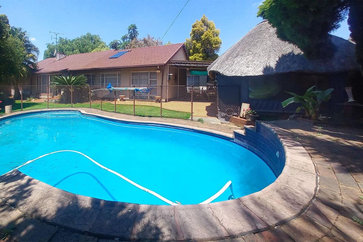 Entertainer’s family retreat in secure boomed Edleen, Kempton Park, walking distance to Edleen Laerskool; thatched lapa and pool, separate flatlet; three bedrooms, two bathrooms, double garage.