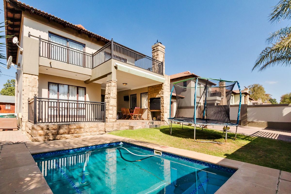 Discover this exquisite 4 bedroom Balinese style home in the prestigious Bali on Glen security estate offering serene indoor and outdoor living. Three bedrooms upstairs feature laminated flooring, two of which open onto a shared balcony overlooking the sparkling pool and manicured front garden. Two full bathrooms upstairs include an en suite to the main bedroom, while downstairs you will enjoy an open plan lounge or TV room, elegant dining area and a modern kitchen with granite tops, melamine cupboards and separate scullery. A sliding door from the dining room leads to a covered patio with built-in braai, perfect for entertaining. The fourth bedroom and third bathroom are also on the ground floor, and additional highlights include a double garage, ample visitor parking, solar-powered backup energy and a beautifully maintained garden.