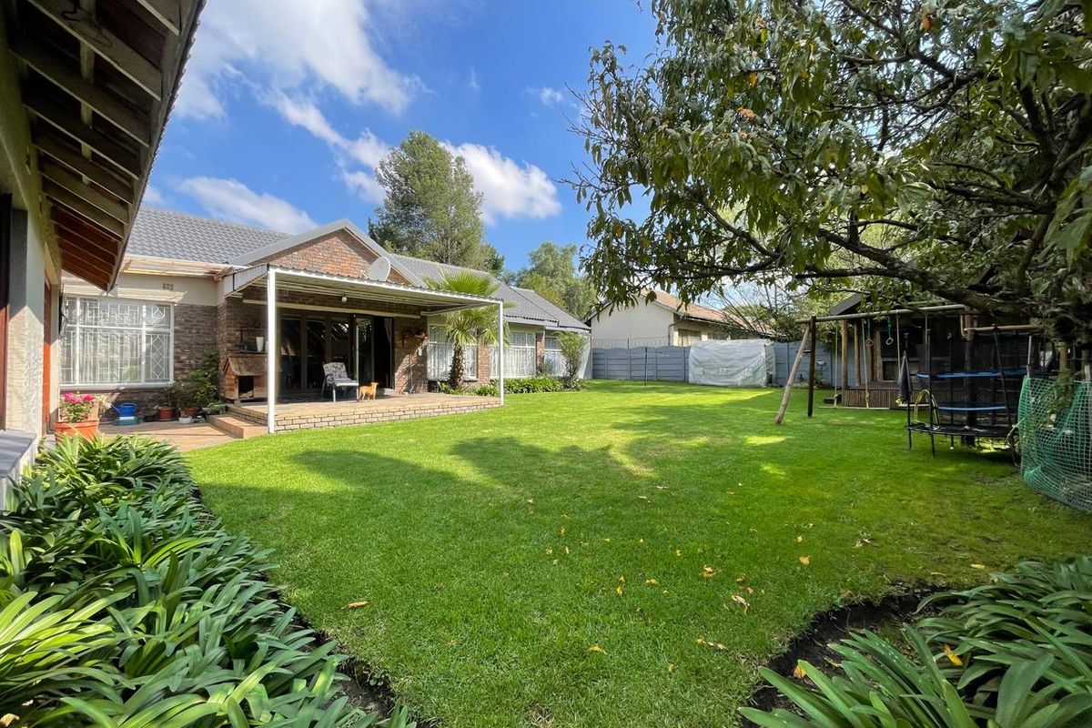Family-focused retreat in a quiet, leafy neighborhood, perfect for entertaining with a thatch lapa, jacuzzi and built-in braai; includes three-bedroom main house and separate garden cottage.