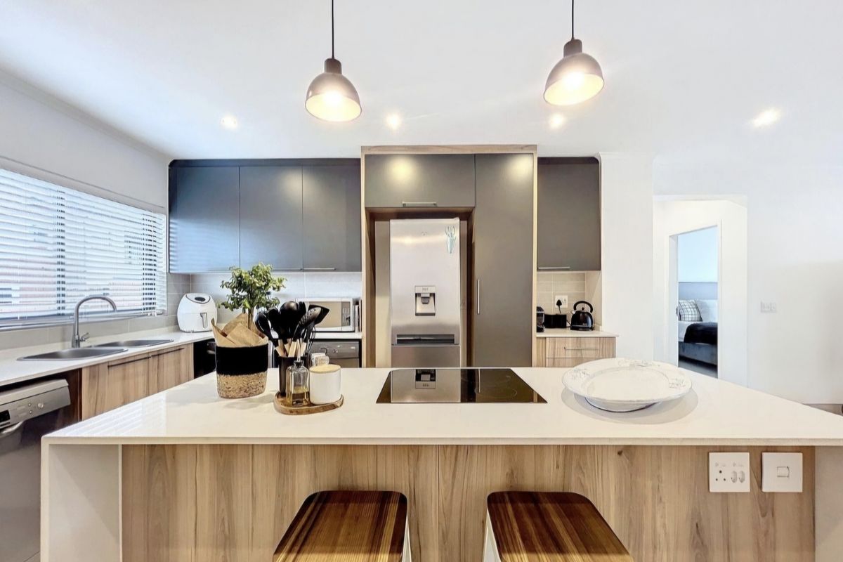 The residence itself boasts a light-filled, open-plan design where the lounge, dining area, and kitchen flow effortlessly together—creating an inviting space for both relaxation and entertaining. The designer kitchen is elegantly finished and accommodates three appliances, a double-door fridge, and a central island complete with a sleek glass-top stove and under-counter oven.