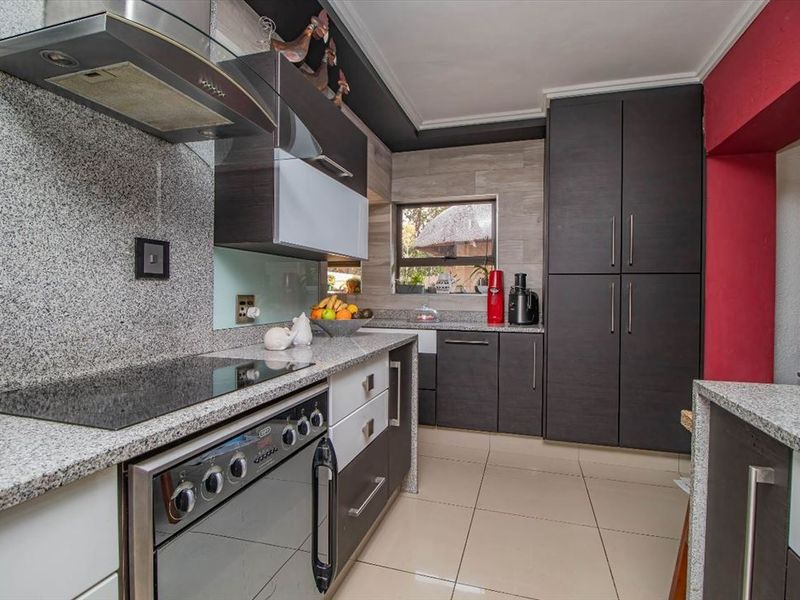 Entertaining-focused family living in a secure, well-kept estate, with a lush garden and covered patio with built-in braai. Modern kitchen, three bedrooms, three ensuites and double garage.