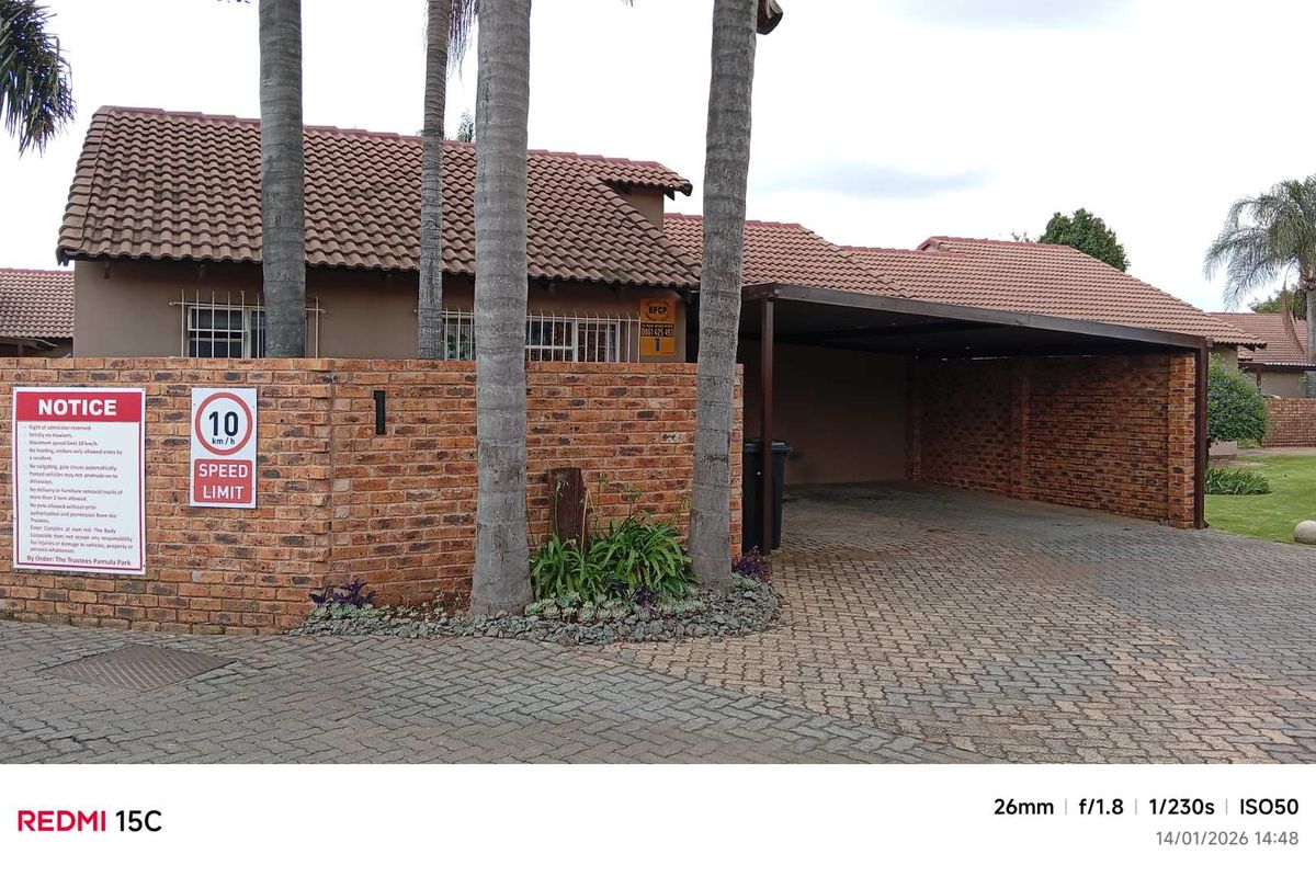 Peaceful family living in sought-after Bonaero Park, corner townhouse with larger wraparound garden and covered patio with built-in braai — three bedrooms, one bathroom and double carport.