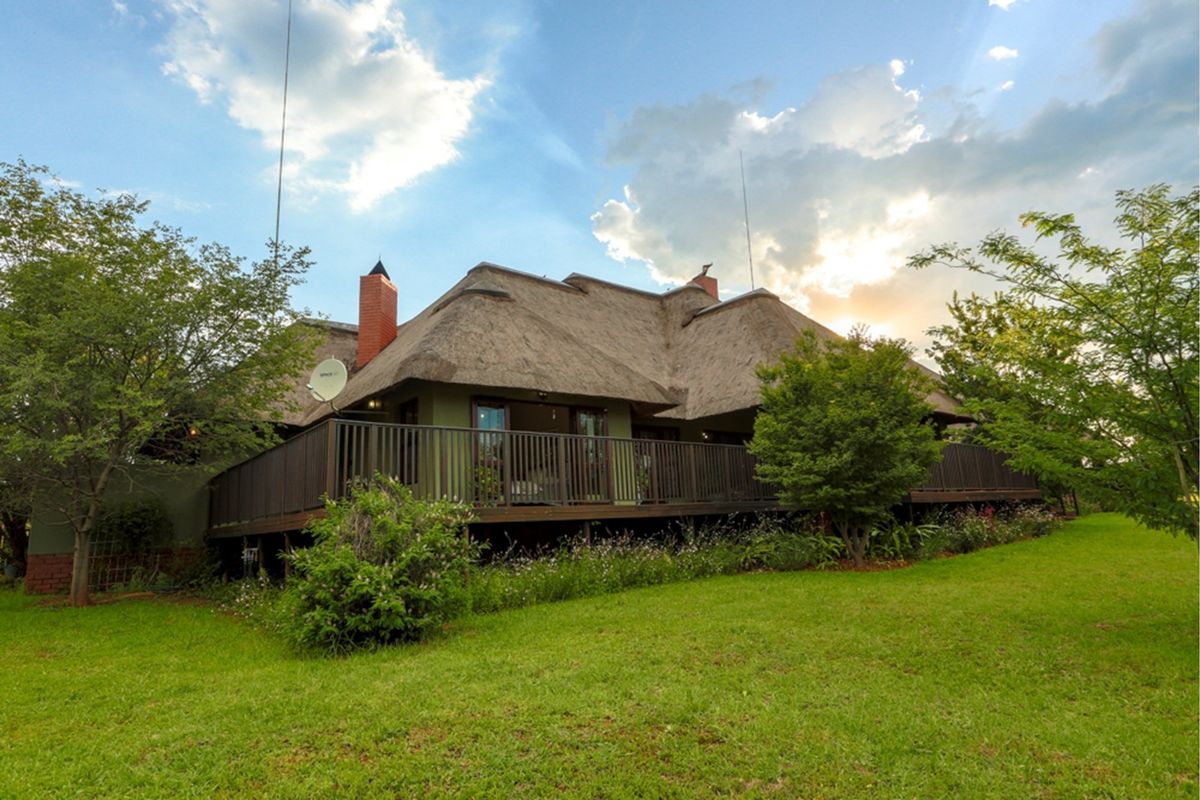 Bushveld retreat on Letamo Game Farm, ideal for extended families — dual-living layout with wraparound deck, serene bush views, free-roaming wildlife, five bedrooms and five bathrooms.