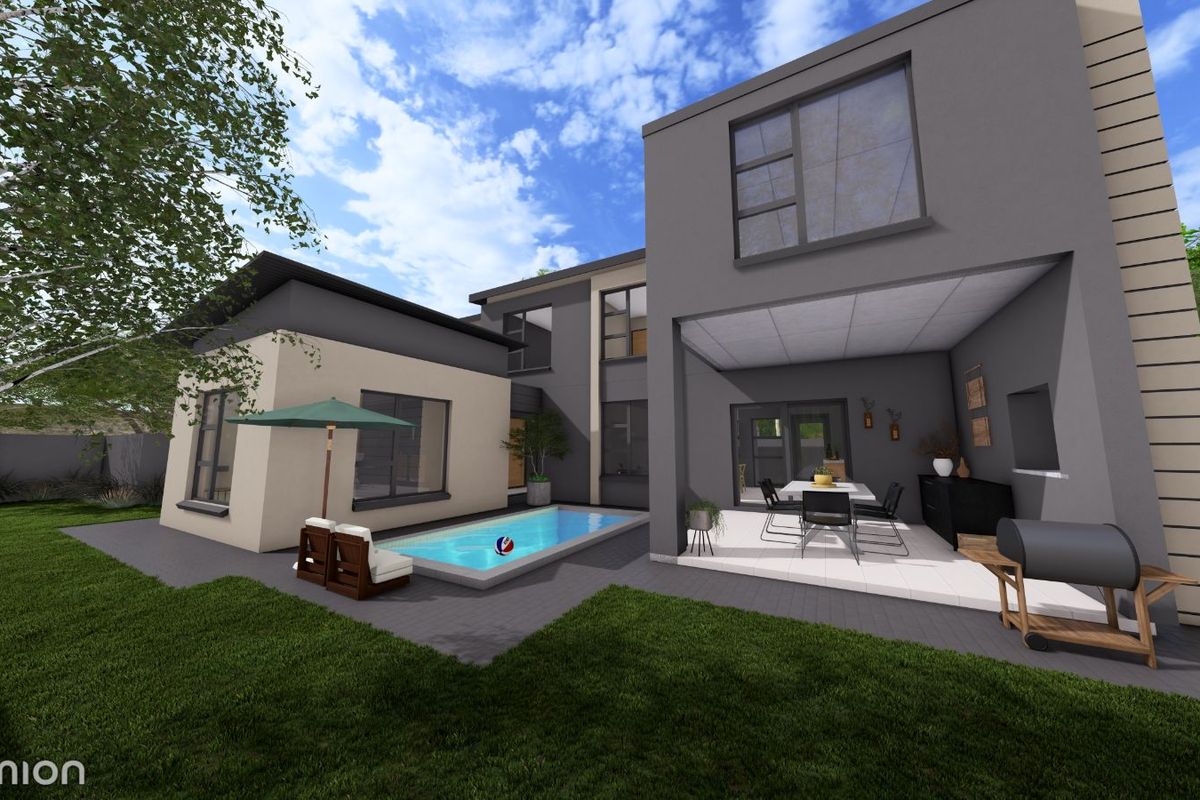 The Ground Floor will have a large open plan dining/kitchen/living room. A built in braai will be in the covered patio interlinking with the kitchen/dining area en overlooking he pool. Scullery will be separate and out of sight. A study/guest/helpers room on the ground-floor with own bathroom makes living convenient. A double garage perfectly placed on this concept plan allowing direct entrance to the house.