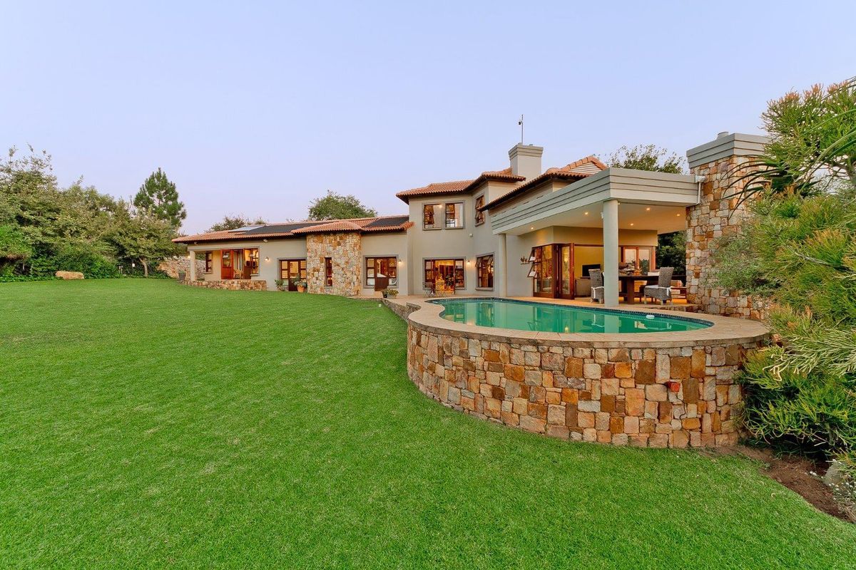 Eye-catching entrance leading into this residence with a modern style, will set the tone of whats ahead. Spacious family lounge with a feature wood burning fireplace spills onto an expansive covered patio with built-in braai, overlooking the sparkling swimming pool and manicured garden, plus a space where the most stunning sunsets and sundowners can be enjoyed by the whole family. This home is an entertainers dream, brilliant outdoor/indoor entertaining. Separate summerhouse / games room with fitted pub, pizza oven and Jacuzzi will be the highlight of all your friends and guests. Open-plan air-conditioned dining area situated adjacent to the kitchen makes entertaining an absolute dream. Awe-inspiring open-plan kitchen with Caesarstone counter tops, centre-island, gas hob with electric oven, prep bowl, double door fridge space, separate scullery area with under counter space for 3 appliances, ample built-in cupboards, plus a massive walk-in pantry. The courtyard thats accessible from the scullery is a few steps away from the veggie garden where all your home grown veggies will thrive. Guest cloakroom neatly tucked away.
