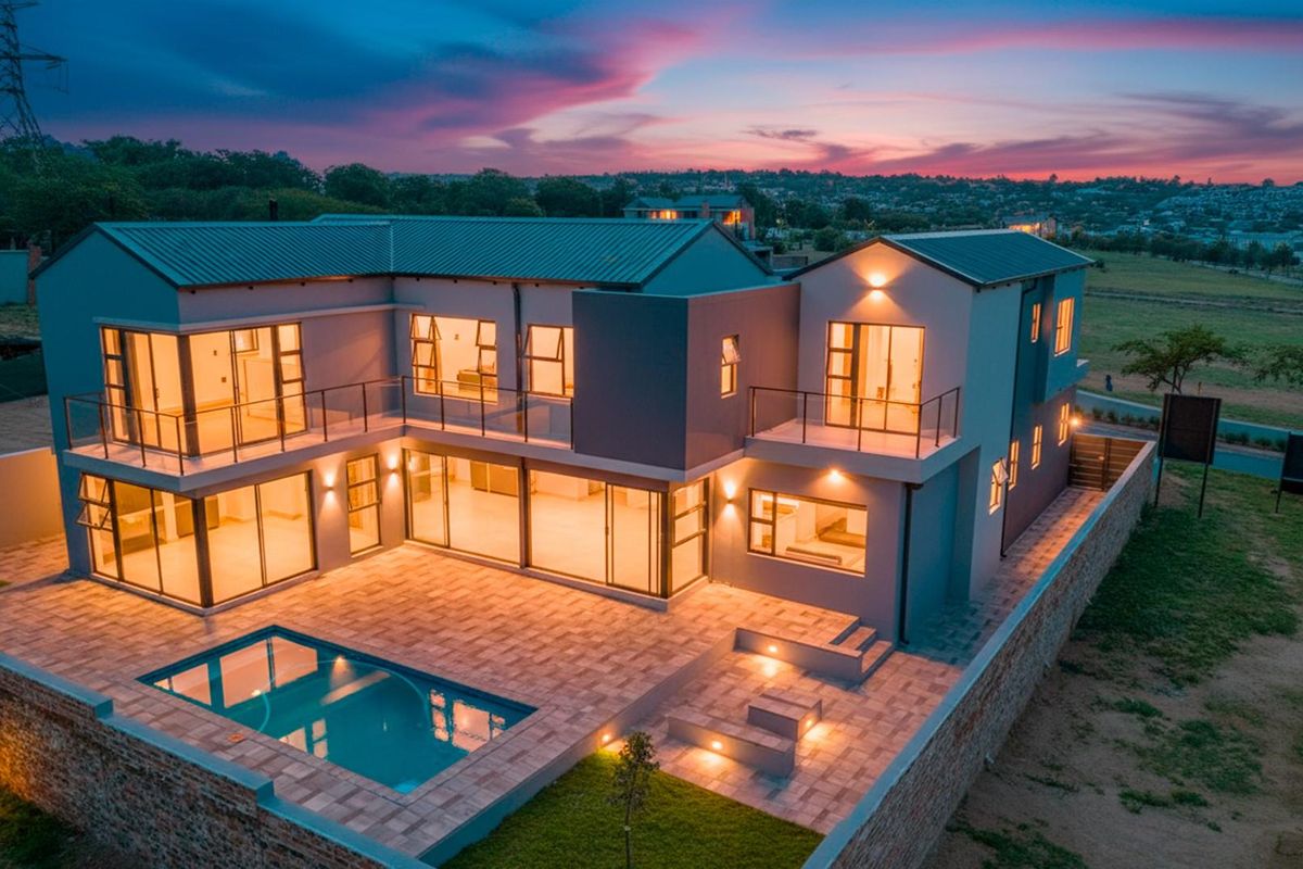 Entertainer's dream in secure Helderfontein Estate with pool, firepit and garden, seamless indoor–outdoor living, private main-suite balcony, plus five bedrooms, five bathrooms and double garage.