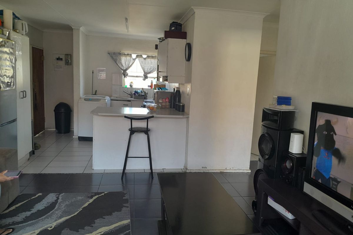 Bright first-floor townhouse in central Vorna Valley, near Waterfall Ridge and Mall of Africa, with a breakfast-bar kitchen, sunlit lounge and balcony, communal pool, 2 beds, 1 bath, covered parking.