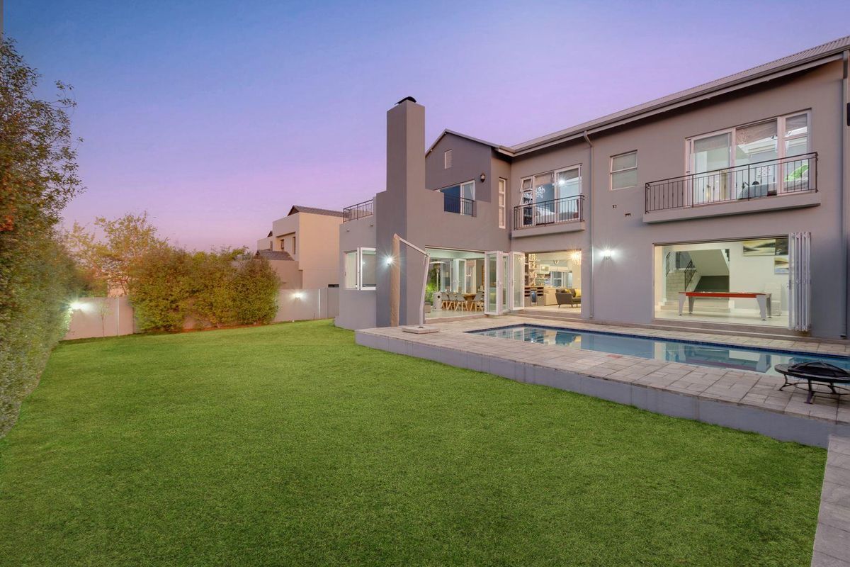 The ground floor spaces are clearly defined where the gourmet eat-in kitchen creates an appealing impression as a focal point, a generous size scullery and a walk- in pantry, a privately situated informal lounge/teen pad( previously a two car garage) as well as a mud room all form part of the east wing, formal lounge, dining room and entertainment room. With stackers doors open onto a stunning covered patio and garden a sparkling heated pool , a pool pavilion that creates additional privacy for the garden . study/fifth bedroom, guest cloak room complete the principal floor.