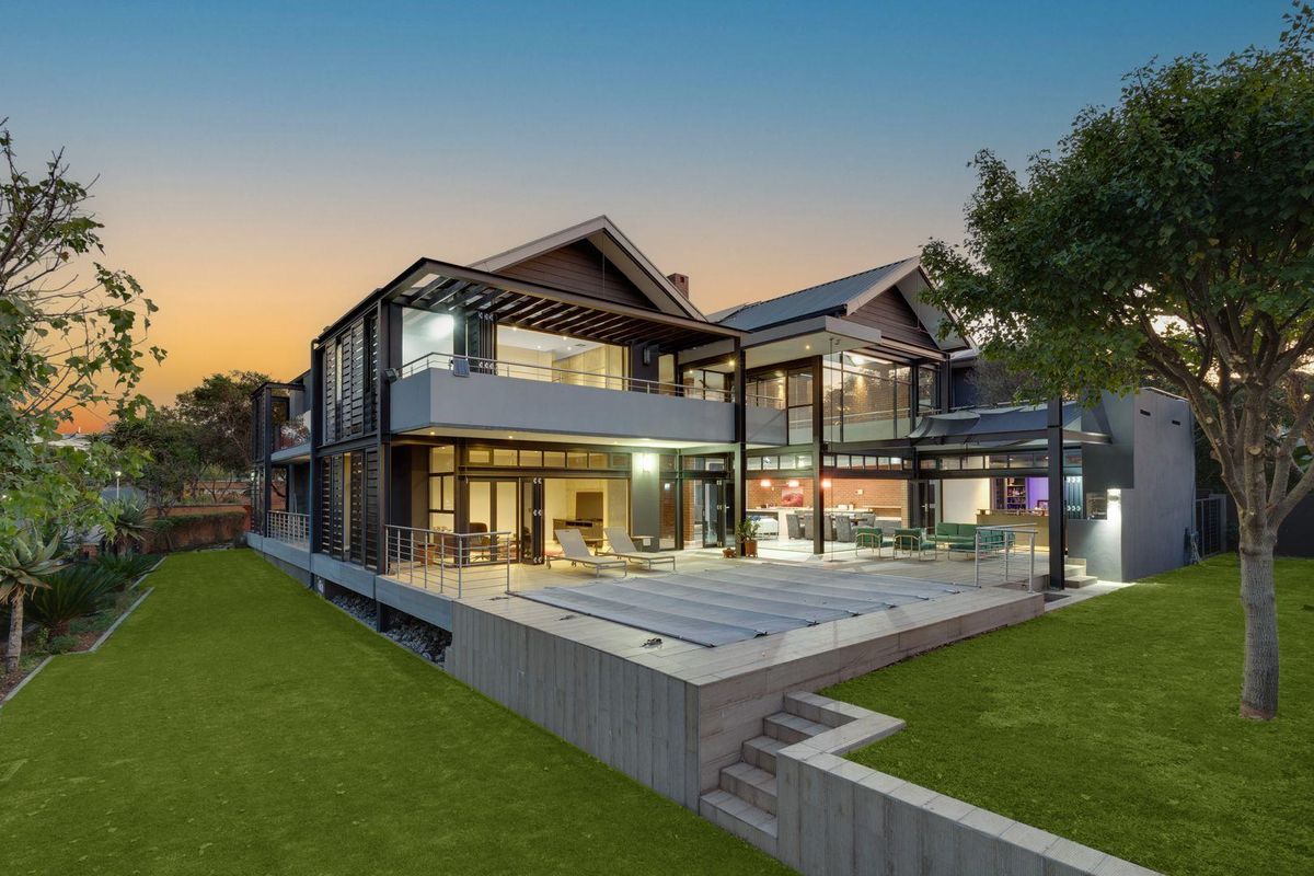 Water features, state of the art lighting and home automation compliments modern day living and is a key element to this home. The double volume entrance hall creates the initial impact drawing you into the home with a desire of wanting to explore more. On the east wing of the principal floor the open plan living area allows for glamorous formal entertaining or a relaxed luxurious informal setting. The gourmet kitchen, complete with integrated appliances, and a concealed scullery, is an integral feature of the home, as well as a custom designed cocktail bar with a gas braai , open plan lounge and dining room share a gas fireplace for the winter evenings . This area is further enhanced when the tall stacker doors are opened onto the covered patio. The garden and swimming pool complement the overall impressionistic appeal. The remaining living spaces include formal lounge, study, privately situated guest bedroom with en-suite bathroom .