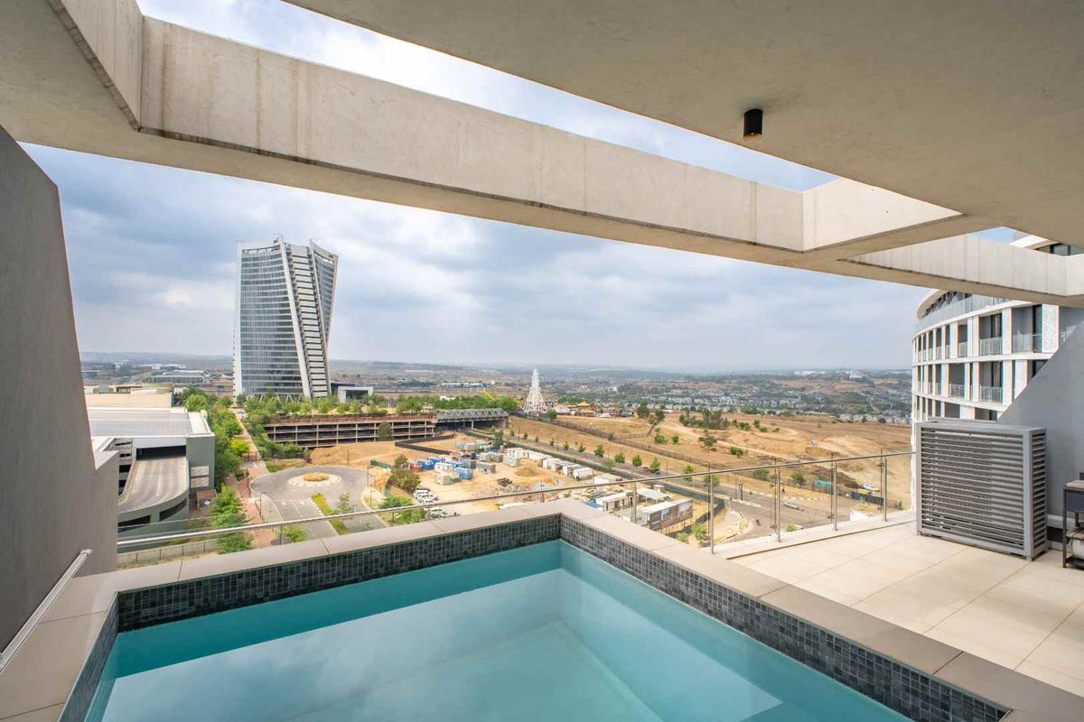 Elevated living with panoramic views and expansive balcony in Ellipse, Kepler Tower — near Mall of Africa and Waterfall City CBD. Double-level penthouse; two bedrooms, 2.5 baths, two garages.