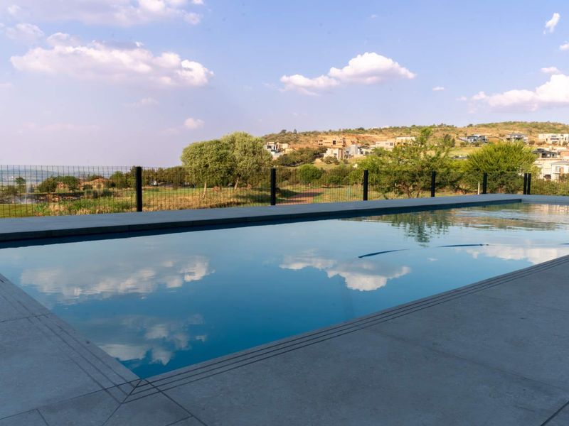 Entertain effortlessly at Eye of Africa, enjoying panoramic golf-course views from a covered patio with built-in braai and heated pool—four en-suite bedrooms plus staff quarters and solar backup.