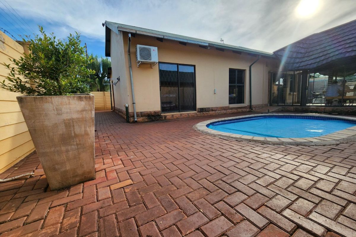Entertain effortlessly in the private swimming pool and enjoy the spacious garden, perfect for children and pets to play. Additional features include a storage room, a double garage with automated doors and extra space for storage or a workshop, and a state-of-the-art 8kW solar system with inverter and batteries supported by 14 solar panels. The inviting patio/lapa with built-in glass doors and braai area completes this home, offering the perfect setting for gatherings and relaxation.
