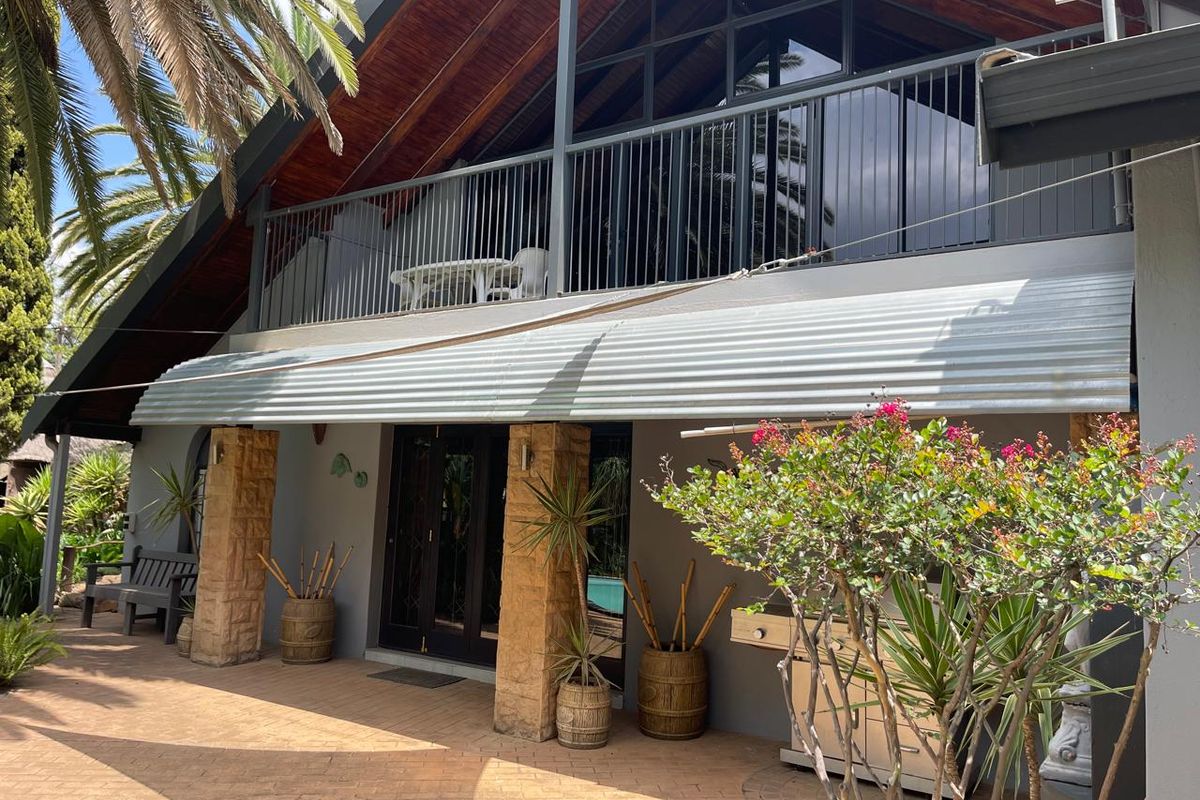 Relax by the swimming pool or gather around the boma and patio area. The beautifully landscaped garden is complemented by a pond with ducks, a jungle gym for children, and an enchanting lapa with a bar. The entire property is secured with a thirteen-strand electric fence and motorized access gates for peace of mind.