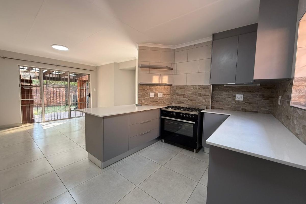 Completely renovated duet in a quiet, established neighbourhood — Caesarstone kitchen, ensuite domestic quarters, two living areas, automated garage and carport; upgraded plumbing and security. 2 beds, 2 baths.