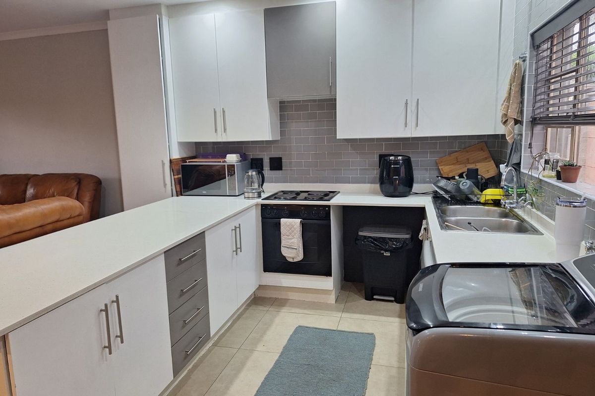 This home boasts a modern open-plan layout featuring a stylish kitchen with sleek cabinetry, ample counter space, and quality finishes. The spacious lounge and dining area flow effortlessly to a covered patio with a built-in braai, perfect for entertaining and relaxing. The private, fully walled garden offers peace, privacy, and a touch of greenery.
