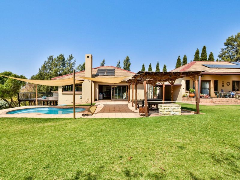 Entertainer's family retreat set on a 5,300m² garden stand in quiet gated grounds, with pool, deck and 3,500L/hr borehole plus solar backup — five bedrooms, 4.5 baths, double garage.